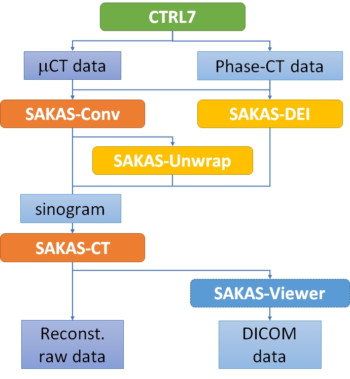 等の計測条件に加えて、フィルター関数など再構成の画像処理条件に至る全ての条件を統合的に取り扱い、保存できるデータ・カルテシステム(SAga ls KArte System:SAKAS、サーカス)の構築を進めています。SAKASでは、これまで計測制御ソフトや処理ソフトで個別に保存していた条件を、テキスト形式(windowsのiniファイルと同じ構成)で1個のカルテ(Tag)ファイルとして管理するため、どのような処理がどのような条件で行われたか容易に記録・確認することができます。