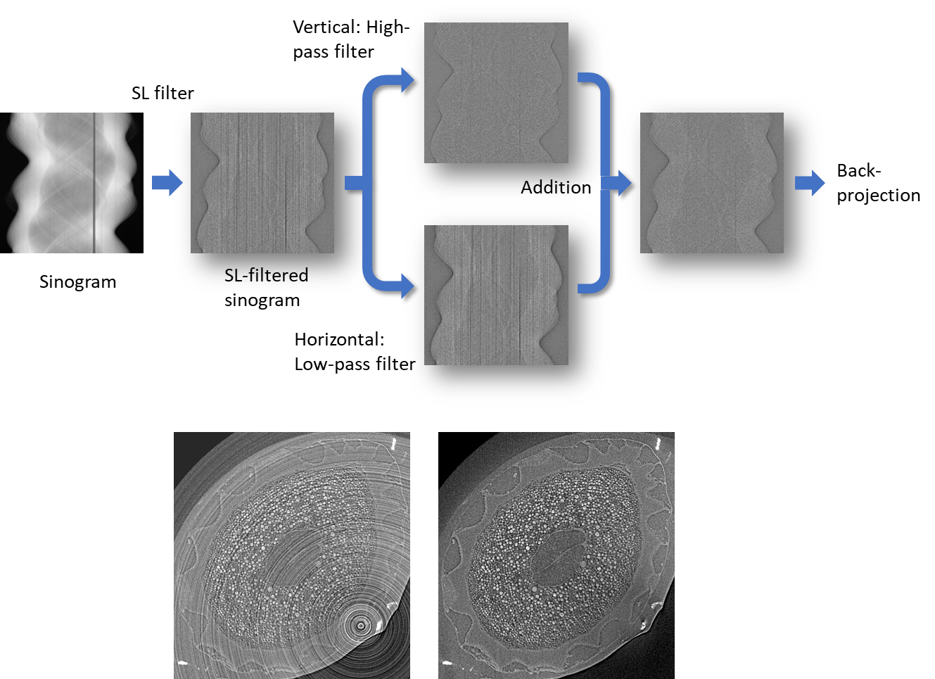 サイノグラムにおける縦方向のハイパスフィルターと横方向のローパスフィルターの組合せにより、縦ストライプ、すなわちリングアーチファクトを低減するフィルター[1]を組み込んでいます。単純なフーリエ変換から構成されるため、パラメータの設定が単純で、高速かつ汎用性が高いことが特徴で、本機能により、検出器の感度ムラや入射X線強度の揺らぎに起因したリングアーチファクトを大幅に低減することが可能になります。